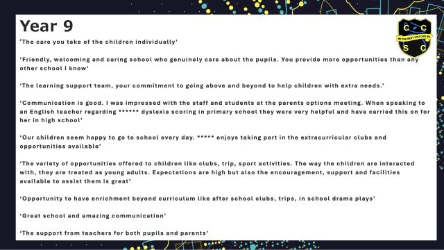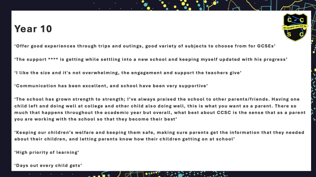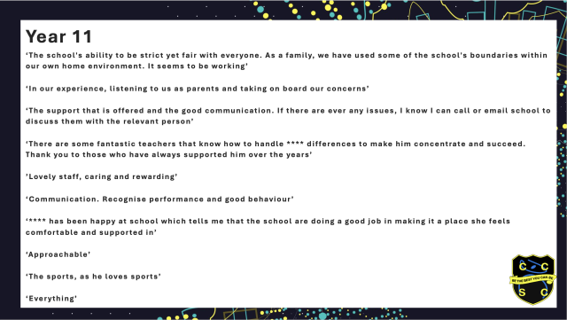Parents praised the school’s focus on wellbeing, communication, and support, as well as the wide range of experiences and enrichment opportunities offered to pupils throughout their time at CCSC.