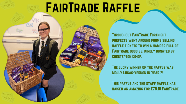Prefects also sold raffle tickets during the fortnight for a chance to win a hamper full of Fairtrade goodies, kindly donated by Chesterton Co-op. The lucky winner was Molly L (Year 7)!