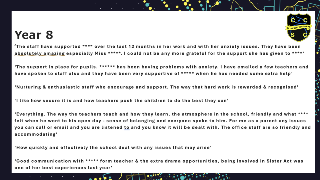 Parents praised the school’s focus on wellbeing, communication, and support, as well as the wide range of experiences and enrichment opportunities offered to pupils throughout their time at CCSC.